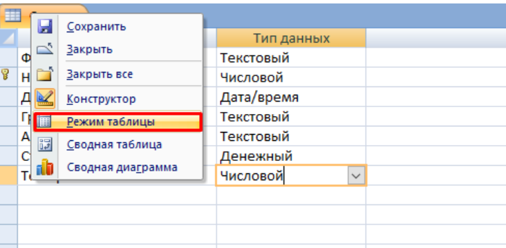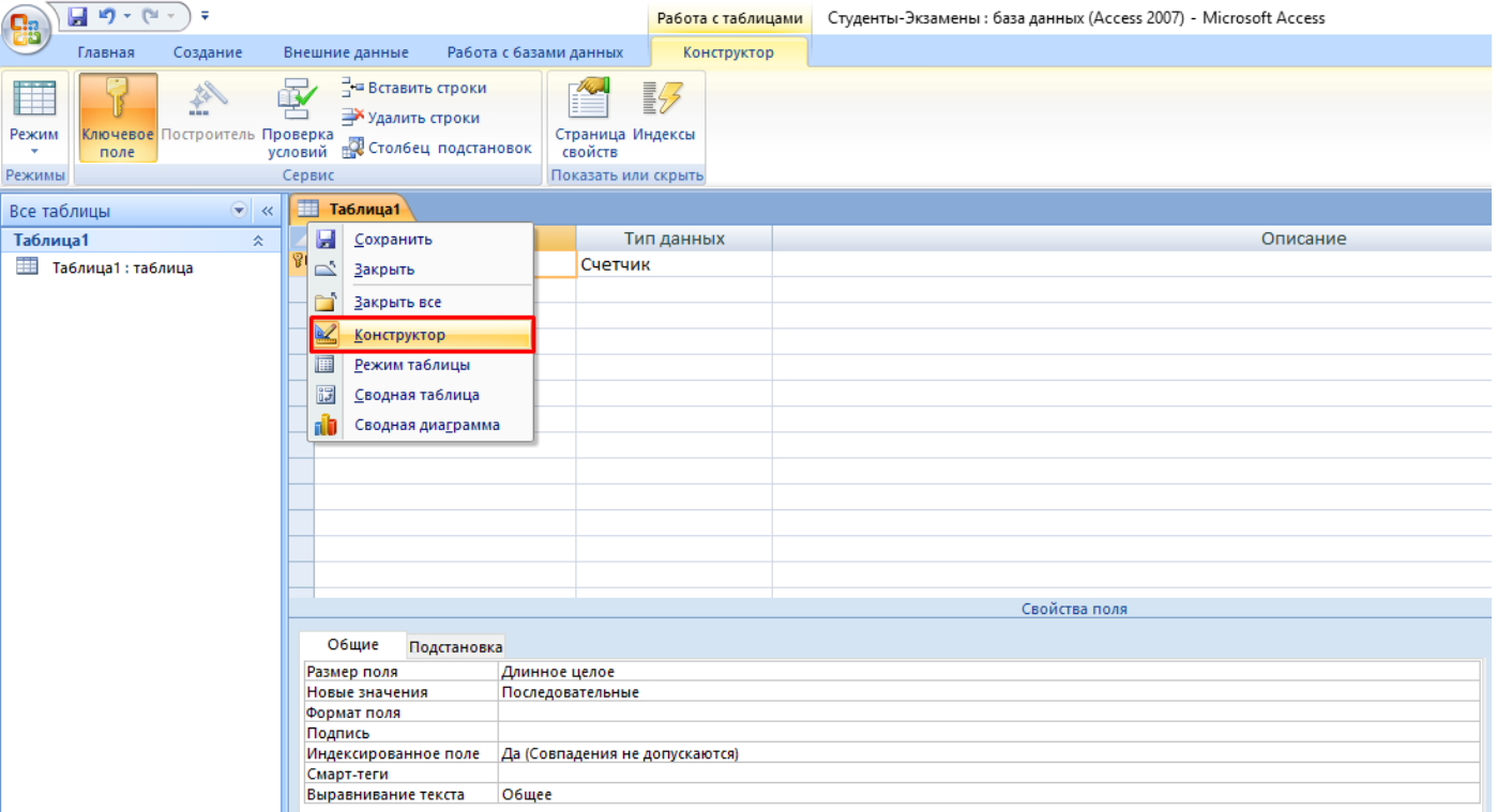 1. Нажмите ПКМ по вкладке «Таблица1» и выберите «Конструктор».