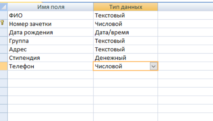 2. Теперь начинайте заполнять названия полей и соответствующий им тип данных, который будет использоваться.