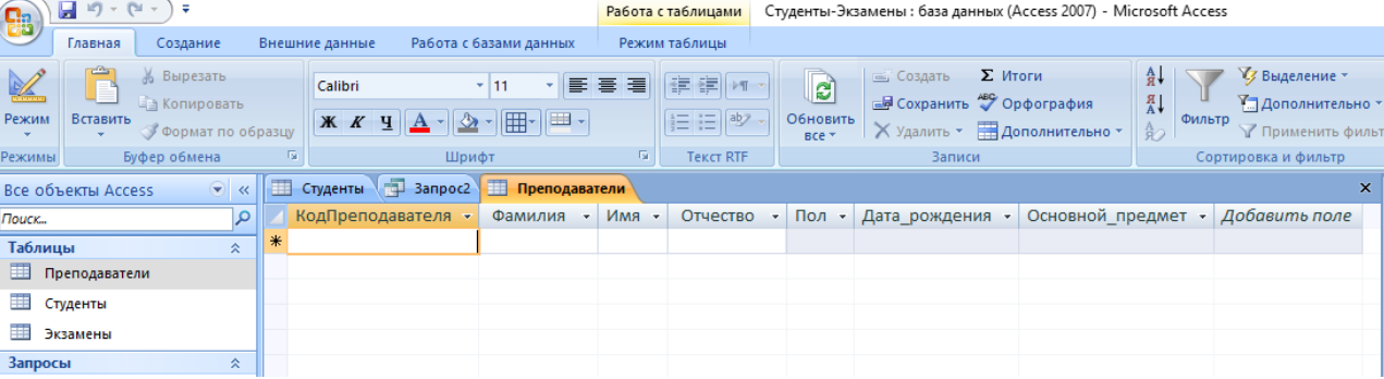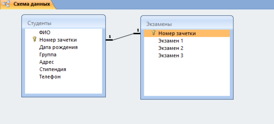 Для наглядности всей теории создадим тренировочную базу данных «Студенты-Экзамены», которая будет содержать 2 таблицы: «Студенты» и «Экзамены». Главным ключом будет поле «Номер зачетки», т.к. данный параметр является уникальным для каждого студента. Остальные поля предназначены для более полной информации об учащихся.