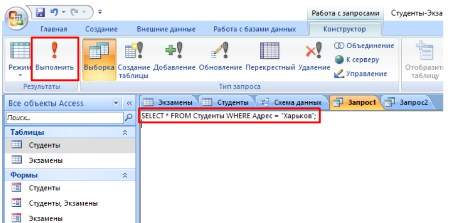 4. В текстовое поле введите команду: SELECT * FROM Студенты WHERE Адрес = «Харьков»; где «SELECT *» означает, что выбираются все студенты, «FROM Студенты» — из какой таблицы, «WHERE Адрес = «Харьков»» — условие, которое обязательно должно выполняться.