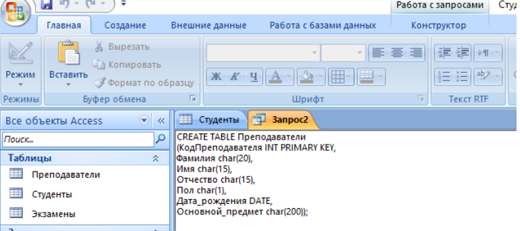 CREATE TABLE Преподаватели (КодПреподавателя INT PRIMARY KEY, Фамилия CHAR(20), Имя CHAR (15), Отчество CHAR (15),
