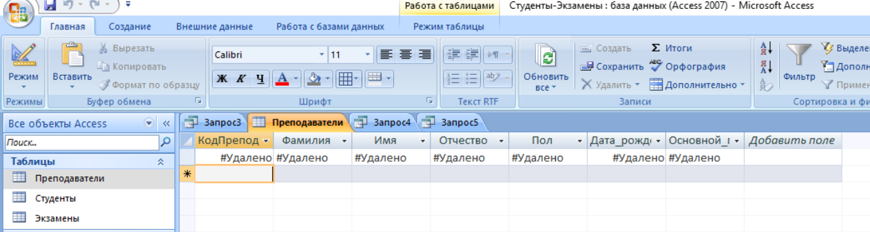 Перед тем, как приступить к связыванию двух сущностей, по аналогии с предыдущим пунктом нужно создать и заполнить таблицу «Экзамены». Она имеет следующие атрибуты: «Номер зачетки», «Экзамен1», «Экзамен2», «Экзамен3».
