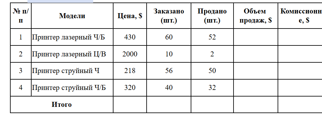 Итого = сумма по столбцам Продано, Объем продаж и Комиссионные.