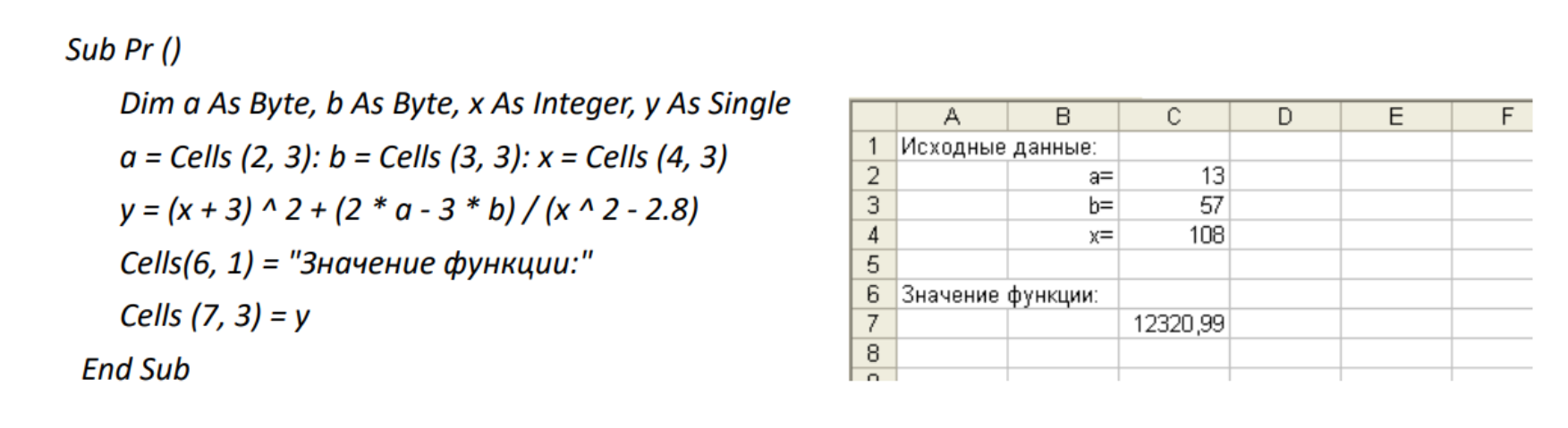 x=Cells(5,3). Value Переменной х присваивается значение ячейки С5