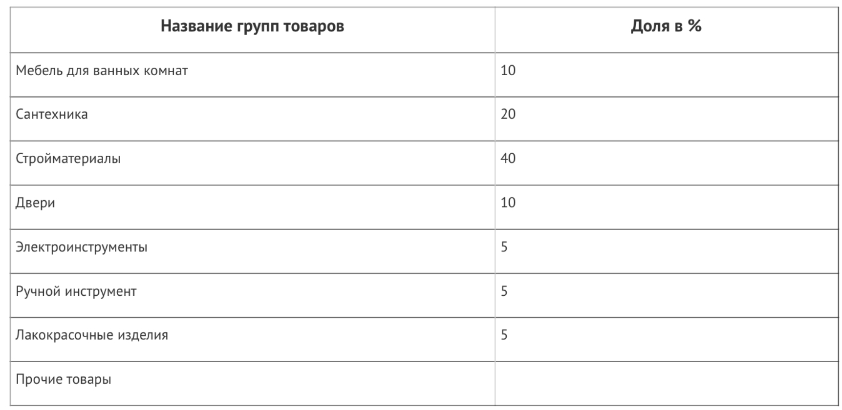 Средствами табличного редактора постройте круговую диаграмму под названием "Номенклатура товара строительного магазина". Диаграмма должна быть снабжена легендой и подписями данных. Подсчитайте долю прочих товаров, если вся сумма товаров принимается за 100%.