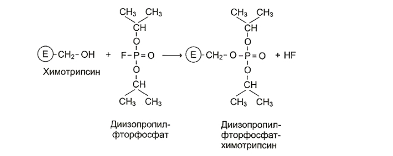 а) ДФФ относится к специфическим необратимым ингибиторам «сериновых» ферментов, т.к. он образует ковалентную связь с гидроксильной группой серина в активном центре фермента при условии определенного окружения радикала серина – Асп, Сер, Глу. Вывод, сделанный студентом, о наличии в активном центре ферментов Е1и Е2серина, правильный.