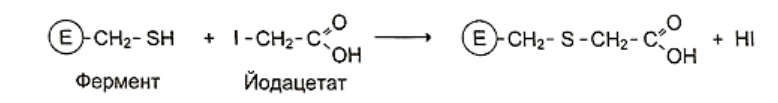 Использовать монойодуксусную кислоту для установления структуры функциональных групп активного центра фермента нельзя. Это вещество относится к необратимым неспецифическим ингибиторам ферментов и образует ковалентные связи со свободными SH-группами цистеина, занимающими любое положение в молекуле белков. Вывод студента о наличии SH-группы в активном центре ферментов Е1, Е2и Е3 необходимо проверить, применяя специфические ингибиторы;