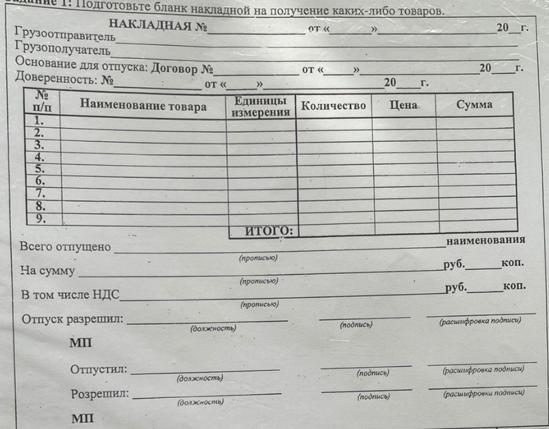Задание 1. Подготовьте бланк накладной на получение каких-либо товаров.