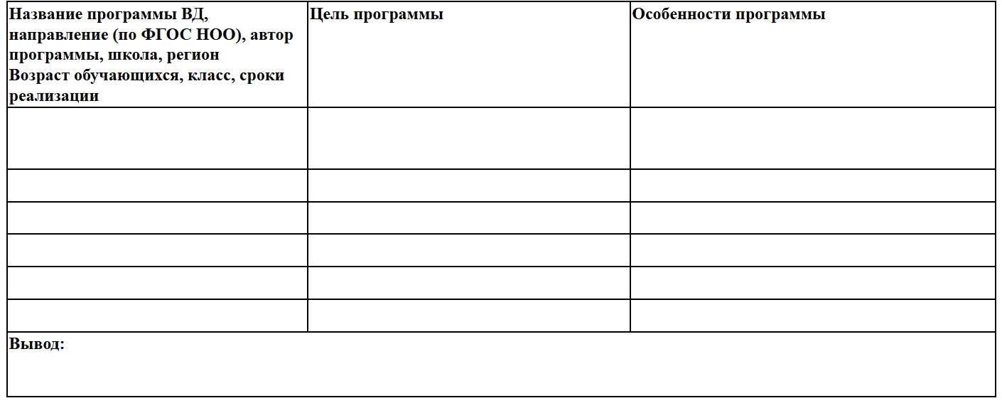 Задание №1. Изучить 5 программ внеурочной деятельности, заполнить таблицу, сделать вывод.