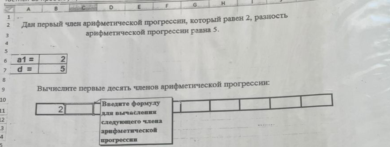 Дан первый член арифметической прогрессии, который равен 2, разность арифметической прогрессии равна 5. Вычислите первые десять членов арифметической прогрессии. (последовательность чисел (членов прогрессии), в которой каждое число, начиная со второго, получается из предыдущего добавлением к нему постоянного числа d (шага, или разности прогрессии).