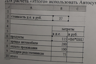 При расчетах затрат в рублях необходимо использовать абсолютные и относительные ссылки. В ячейку С6 :ввести формулу =В6*$В$2. Скопировать формулу в диапазон С7:С9. Значение ячеек В10 и С10 рассчитать при помощи Автосуммы.
