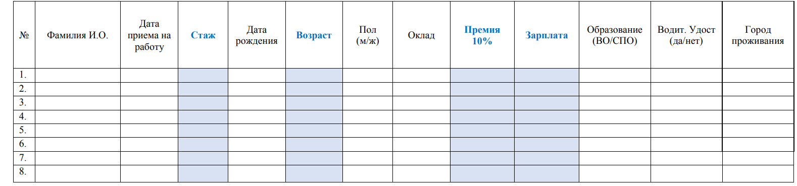 1) Самостоятельно внести данные: Фамилия И.О.; Дата приема; Дата рождения; Пол; Оклад; Образование; Водит.