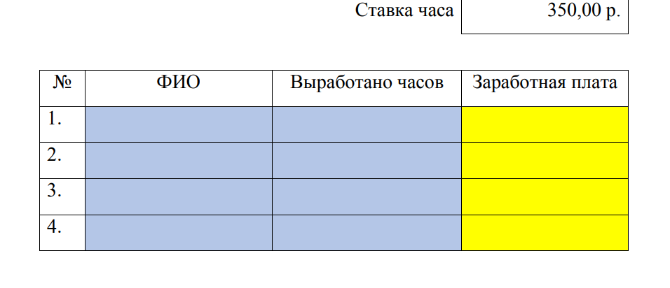 таблице. Самостоятельно внести фамилии и количество выработанных часов.