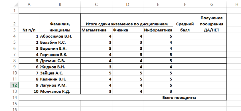 Известны итоги сдачи экзаменационной сессии студентами 1 курса. Поощрения за успехи в учебе получают студенты, у которых средний балл по итогам экзаменов выше 4,50. Составить ведомость на поощрение курсантов.