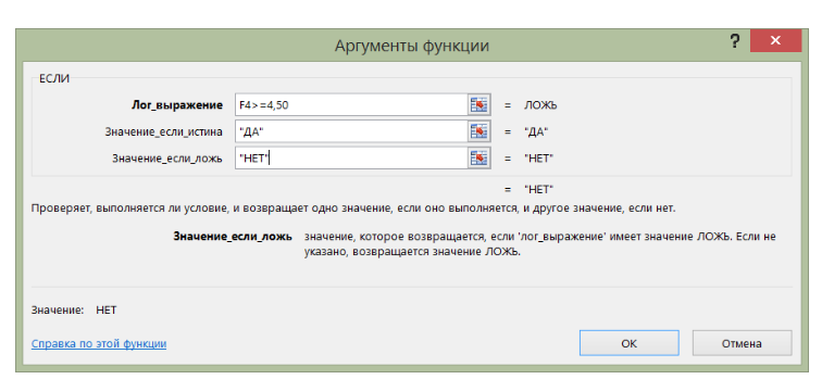 В окне Аргументы функции ЕСЛИ в поле Лог_выражение введите F4>=4,50, в поле Значение_если_истина – ДА, в поле Значение_если_ложь – НЕТ (cм. Рисунок ниже), нажмите ОК.