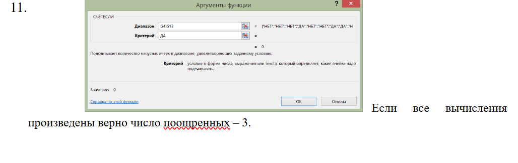 В окне Аргументы функции СЧЕТЕСЛИ указать в полях аргументов их значения, как показано на рисунке ниже, нажать ОК.