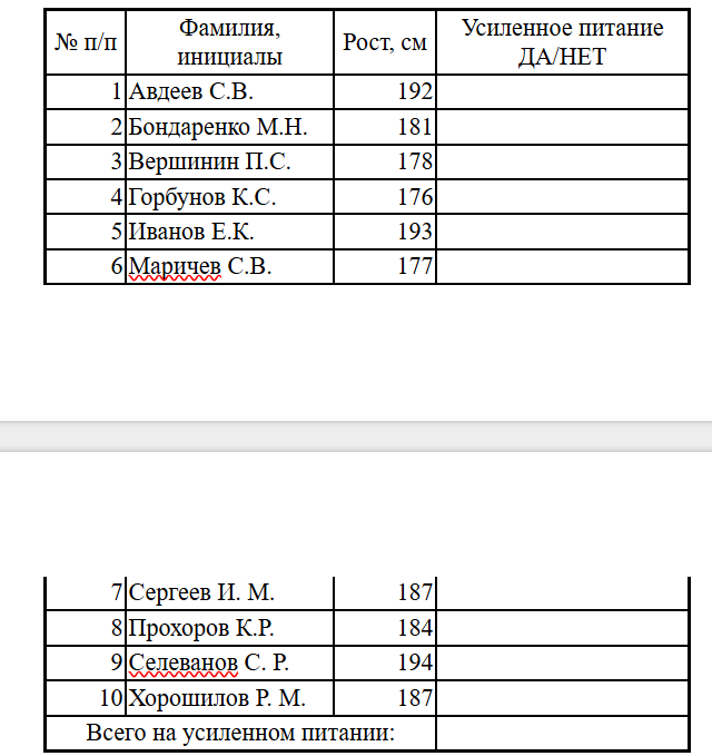 На Рабочем листе самостоятельно сформировать таблицу, содержащую сведения о назначении курсантов на усиленное питание. Усиленное питание назначается для курсантов, рост которых превышает 190 см. Образец таблицы представлен ниже.