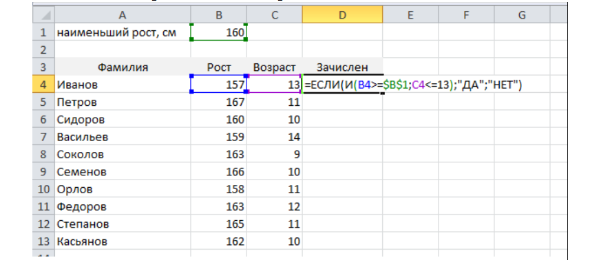 =ЕСЛИ(И(В4>=$B$1;C4<=13);«ДА»;«НЕТ»).