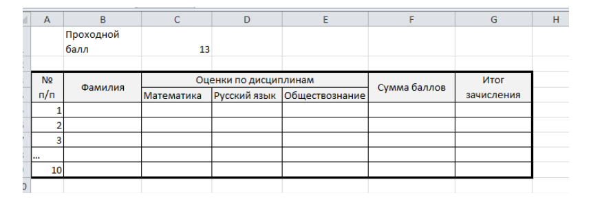 Самостоятельно разработать и заполнить таблицу, содержащую сведения об абитуриентах: фамилия, оценки за экзамены по математике, русскому языку и обществознанию, сумму баллов за три экзамена и итог зачисления. Образец таблицы представлен ниже. Столбцы Фамилия и Оценки по дисциплинам заполнить самостоятельно на 10 человек (для заполнение столбца Фамилия можно воспользоваться данными с Листа 2). Столбец Сумма баллов заполняется при помощи функции СУММ(). Для заполнения столбца Итог зачисления использовать функцию ЕСЛИ(). Условия зачисления: если сумма баллов больше или равна проходному баллу и оценка за экзамен по математике – 4 или 5, то абитуриент ЗАЧИСЛЕН в учебное заведение, в противном случае – НЕТ.