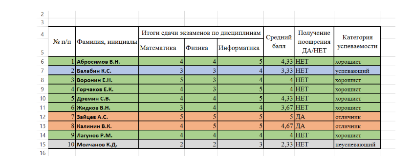 Для реализации задания используется вложенная функция ЕСЛИ. В результирующей таблицы с помощью инструмента Условное форматирование создать правила для заливки категорий студентов по успеваемости (заливка применяется ко всей строке таблицы):