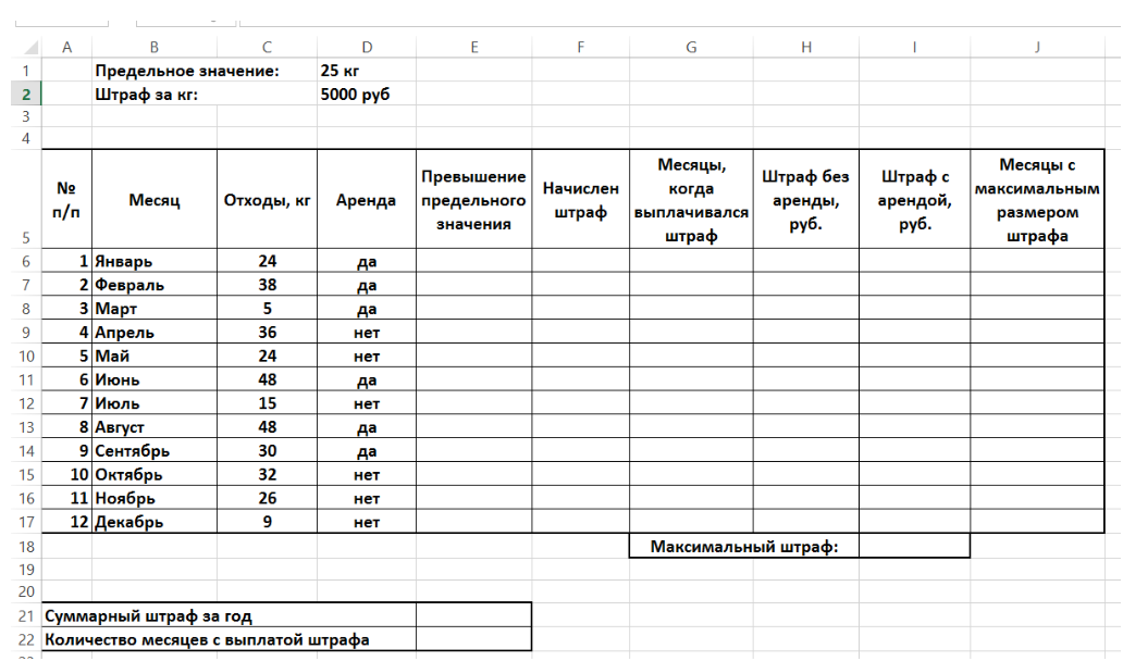 Исходными данными являются месяцы работы предприятия, количество отходов за каждый месяц, а также наличие арендованных помещений на предприятии.