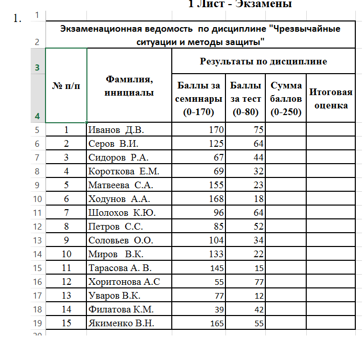 На Рабочем листе экзамены разместить ведомости сдачи экзаменов по дисциплинам: «Чрезвычайные ситуации и методы защиты», «Промышленная санитария и гигиена труда», «Организация системы гражданской обороны». Баллы за работу в течении семестра и экзаменационное тестирование для неуказанных дисциплин проставить произвольно.