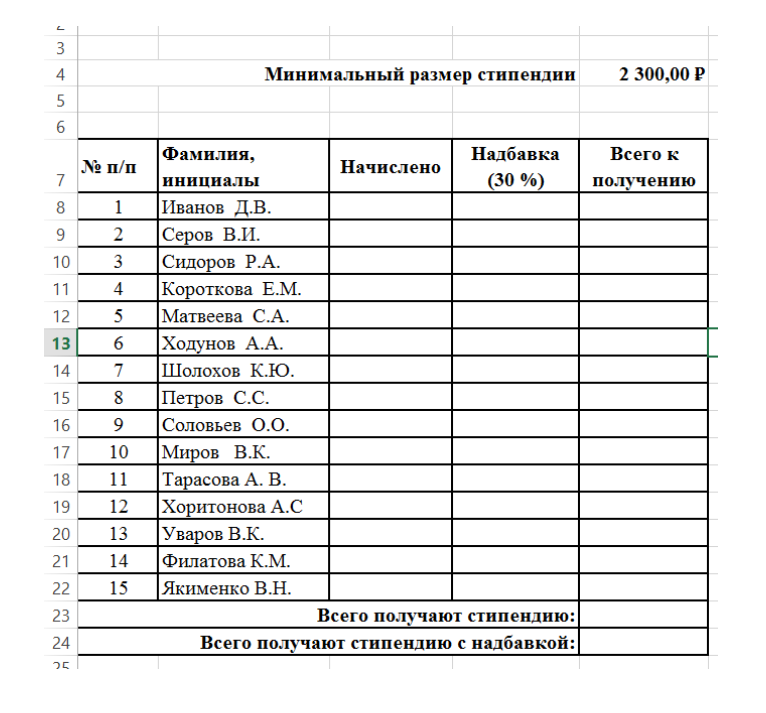 На листе разработать таблицу начисления стипендии по образцу, представленному ниже.