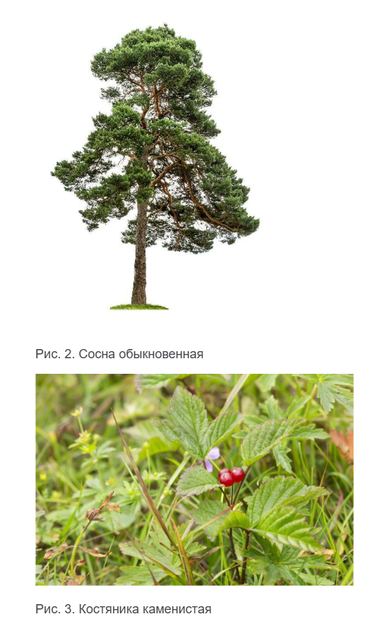 Любое растительное сообщество имеет ярусное строение. Особенно выражена ярусность в лесных фитоценозах. Изображённые на рисунках растения входят в состав сообщества соснового леса — сосняк кустарниково-костяничный.