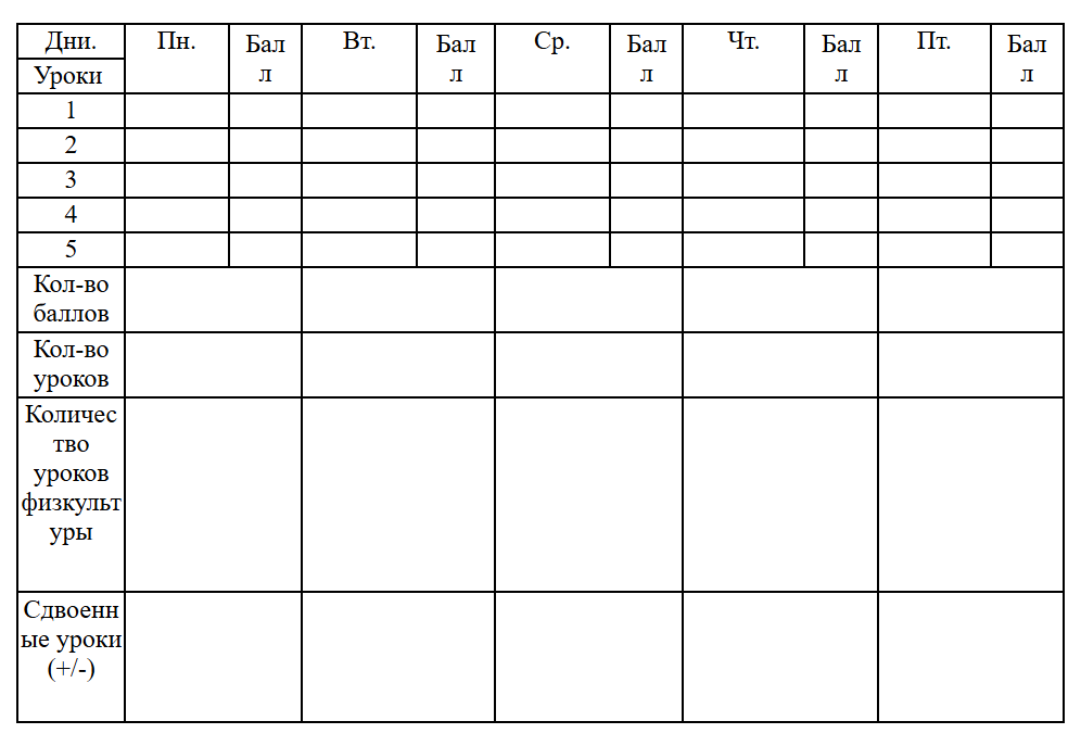 В заключении отобразите динамику работоспособности в течение учебного дня, учебной недели, сложность предметов, количество и длительность больших перемен, время обеда, количество уроков физкультуры, наличие сдвоенный уроков, место дополнительных уроков в расписании; соответствие данного расписания физиологическим особенностям исследуемого возраста.