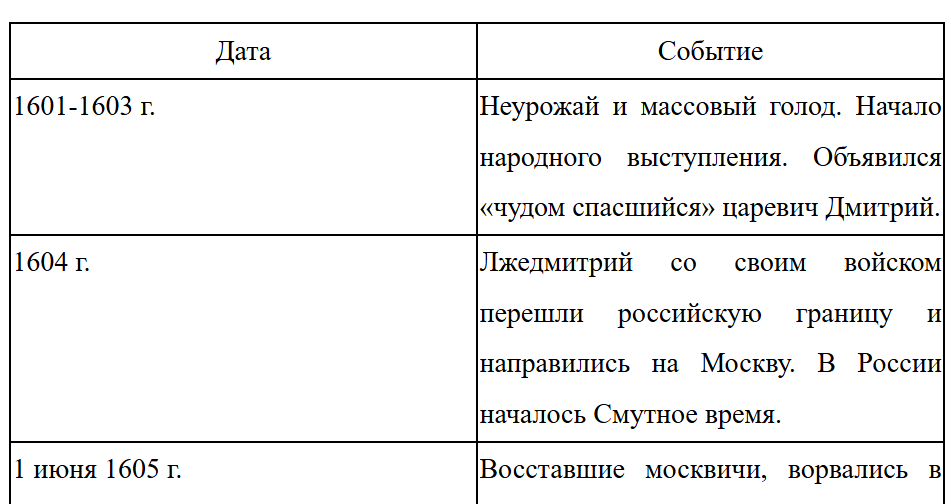 Нужно сделать таблицу «смутное время» в первом столбце даты, а во втором что произошло.