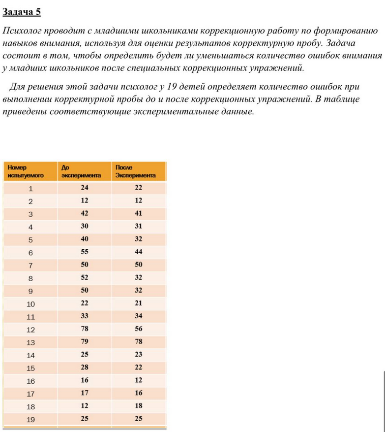 Со школьниками проводится коррекционная работа по формированию навыков внимания. Будет ли уменьшаться количество ошибок внимания у школьников после специальных коррекционных упражнений? В таблице приведено количество ошибок при выполнении корректурной пробы до и после коррекционных упражнений.