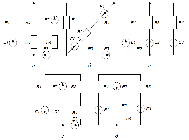 Рассчитать цепь, представленную на рисунке ниже, если Е1 = 10 В; Е2 = 20 В; Е3 = 40 В; R1 = 3 Ом; R2 = 1 Ом; R3 = 4 Ом; R4 = 2 Ом.